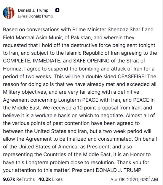 “subject to the Islamic Republic of Iran agreeing to the COMPLETE, IMMEDIATE, and SAFE OPENING of the Strait of Hormuz, I agree to suspend the bombing and attack of Iran for a period of two weeks.”